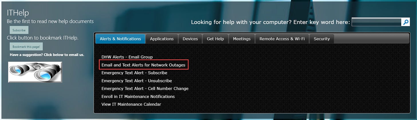 If you're not already subscribed to the text and email alerts for DHW network and system outages, we highly recommend doing so. This simple step will empower you to navigate disruptions and maintain a seamless workday experience.