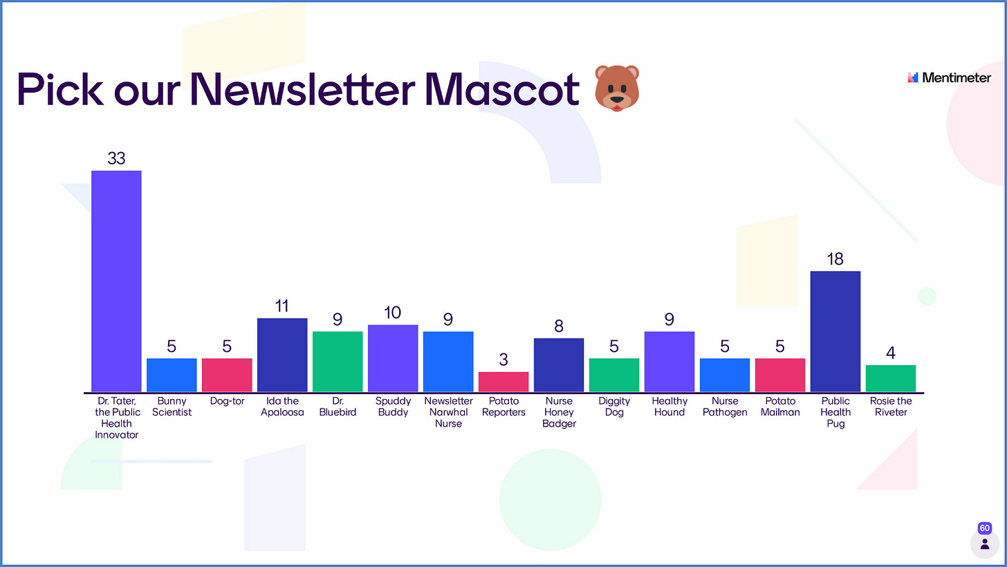 Dr. Tater the Public Health Innovator will debut in next week’s newsletter! Thank you for participating in our first poll series. More to come in the future!